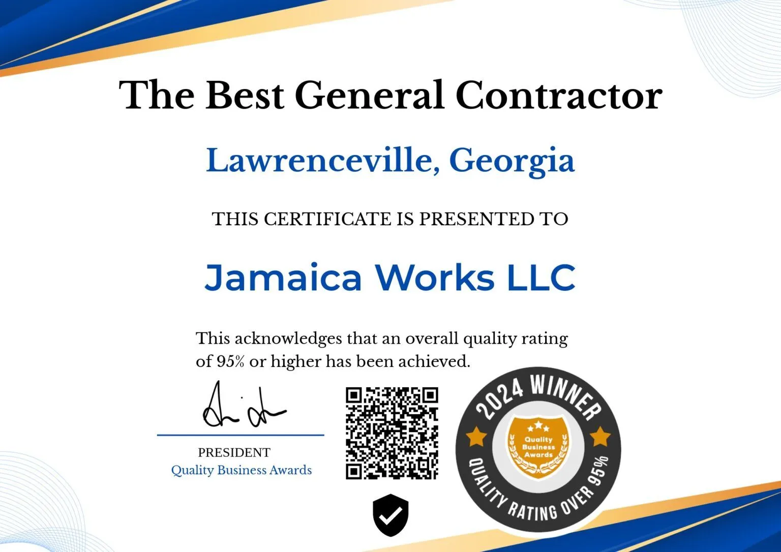 We are excited to share that Jamaica Works LLC has been awarded the distinguished 2024 Quality Business Award for Best General Contractor in Lawrenceville, GA. This recognition is a true reflection of our steadfast commitment to excellence in every aspect of our work, from the initial consultation to the final touches on a completed project. Our dedication to maintaining a strong reputation within the Lawrenceville community has been a driving force behind our success, and this award highlights the importance we place on customer satisfaction, service excellence, and consistent quality in all our endeavors.